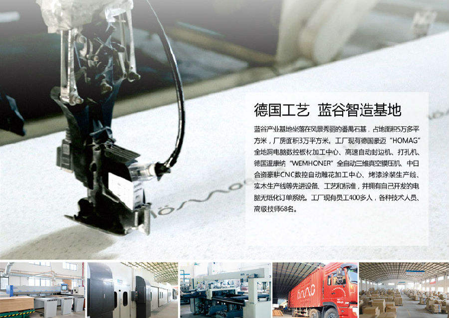 蓝谷产业基地由蓝谷研发中心、运营中心、制造中心、仓储物流中心及协作配套合作企业构成品牌一体化、工艺标准化、管理一致化厨房系统产品产业链集群,占地逾10万平方米的现代化产业中心,配备了全套国际领先的德国豪迈(HOLZMA)进口生产设备,硬件的改变不仅带来了产品规模化专业化全面升级,也使得蓝谷产业结构得到了前所未有的战略性调整,突出的链条式模块化基地功能配备为蓝谷智能厨房的快速发展提供了强有力的后台保障。蓝谷智能厨房通过产品支持、开放标准、共享材料、技术和工艺,结合所在地政府建设部门的标准厨房建筑模数,与业界著名的奥地利BLUM门铰抽屉,马来西亚亿维雅板材,德国雷诺丽特膜皮、瑞好封边、胶王胶水、豪迈进口生产设备等公司合作,采用国际先进的材质与工艺技术保证了蓝谷全系产品的出色品质。