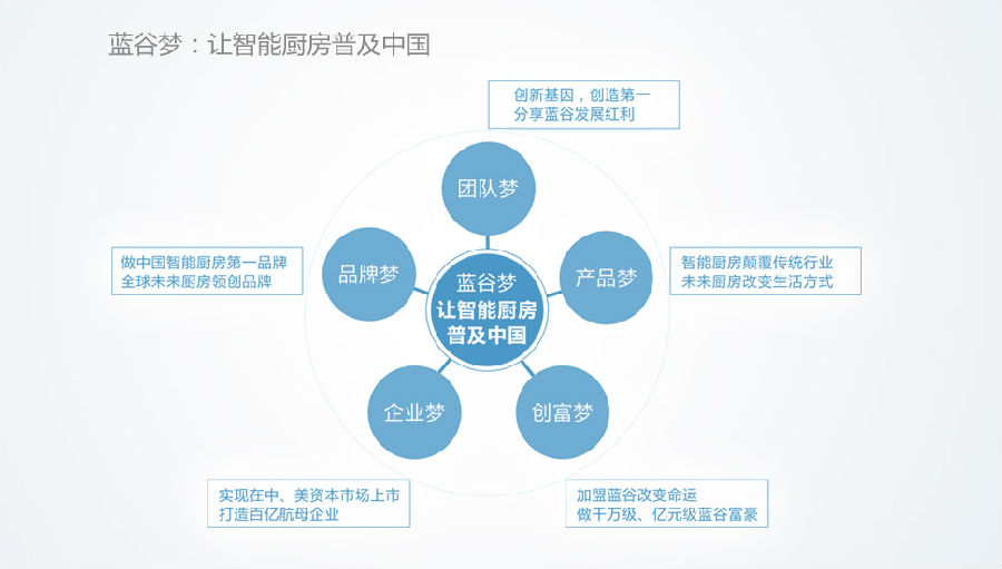 从2007年起,蓝谷智能厨房先后在北京、上海、广州、深圳、成都、重庆、天津等中心城市及省会城市、发达二线城市建立起几百家专卖店,并与红星美凯龙、居然之家等高端建材连锁卖场建立合作关系,同步发展。通过强势终端普及智能厨房全新概念,并将产品销往欧美及东南亚40多个国家和地区。2011年,蓝谷全新推出第四代环保厨房,以六大系统功能配置全环保智能化设计创建环保厨房新标准,同时将专卖店全新打造4S工厂店服务新模式。